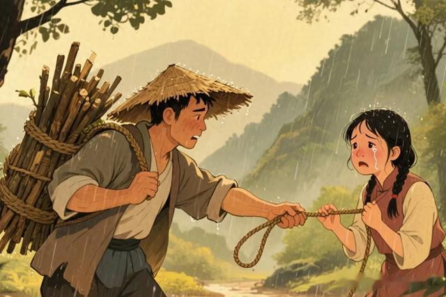 "这荒山野岭的,怎么会有人哭?"大柱心里纳闷,循着哭声走去。穿过一片密林,他看到一棵歪脖子树下,一个身穿素衣的女子正站在雨中,手里拿着一根绳子,看样子竟要寻短见!